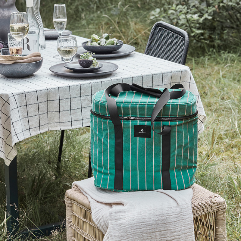 Njut av din picknick med denna snygga kylväska, perfekt för att hålla drycker kalla under utomhusutflykter. Tillverkad av en hållbar blandning av polyester, bomull och viskos och dess gröna bas är prydd med ränder i brunt och off-white för en sofistikerad känsla. Den termiskt isolerade interiören säkerställer att dina drycker förblir kalla vilket gör den till en utmärkt följeslagare för parkbesök, strandutflykter eller skogspicknickar.